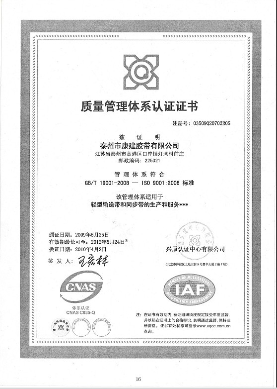 泰州市康建膠帶有限公司經(jīng)過十多年的發(fā)展已經(jīng)成為一家從事輸送帶和傳動帶類及相關(guān)設(shè)備生產(chǎn)和銷售的公司。位于中國經(jīng)濟發(fā)達的長三角經(jīng)濟圈江蘇省泰州市高港區(qū),交通發(fā)達。我司以“合格的產(chǎn)品,滿意的服務(wù)”為宗旨,發(fā)揚團結(jié)、開拓、拼搏爭先的創(chuàng)業(yè)精神,“康建”在全國行業(yè)樹立了良好的企業(yè)形象。“康建”產(chǎn)品已通過ISO9001國際質(zhì)量體系認證,從原料﹑工藝等方面進行了嚴格的控制,從而確保了產(chǎn)品質(zhì)量的穩(wěn)定可靠,成為各......